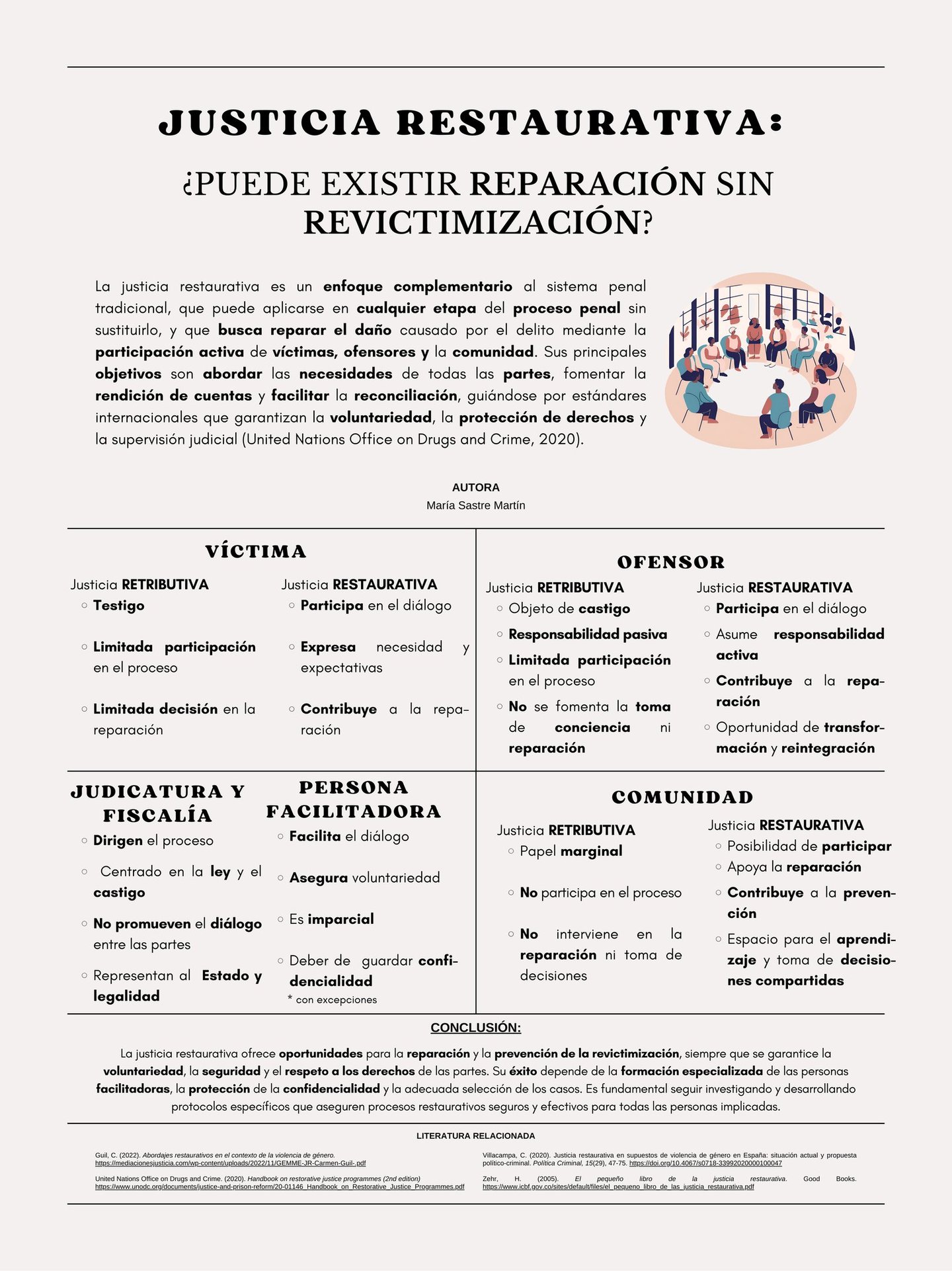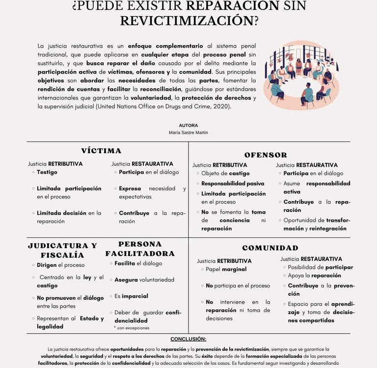 Que la justicia restaurativa sea, pues, no solo un ideal, sino una realidad viva en nuestros tribunales y en nuestras comunidades. Que la reparación del daño, el diálogo restaurativo y la participación activa de las víctimas y los infractores sean los pilares de un nuevo modelo de justicia, más humano, más eficaz y más justo.