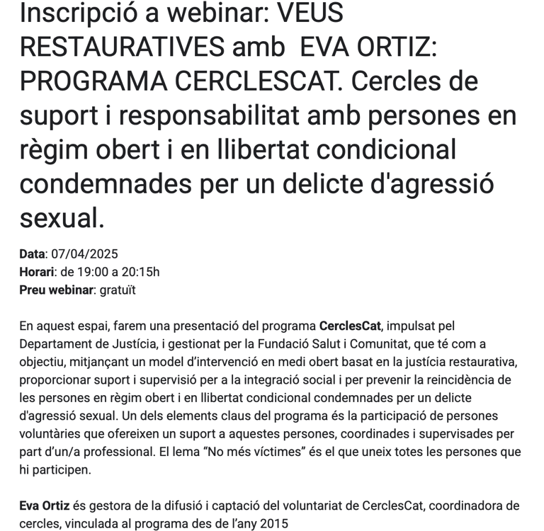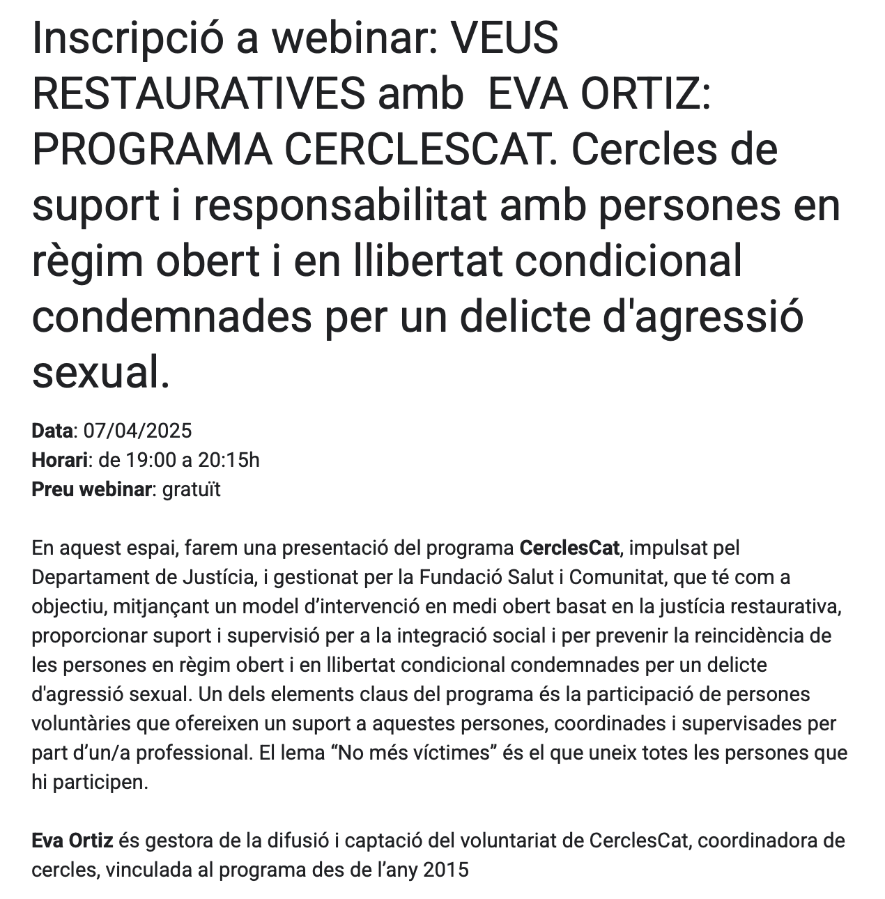 [CAST] El webinar "VEUS RESTAURATIVES con Eva Ortiz" presenta el programa CerclesCat, una iniciativa de justicia restaurativa para la integración social y prevención de la reincidencia. Se centra en el apoyo a personas condenadas por delitos de agresión sexual. [CAT] El webinar "VEUS RESTAURATIVES amb Eva Ortiz" presenta el programa CerclesCat, una iniciativa de justícia restaurativa per a la integració social i prevenció de la reincidència. Es centra en el suport a persones condemnades per delictes d'agressió sexual.